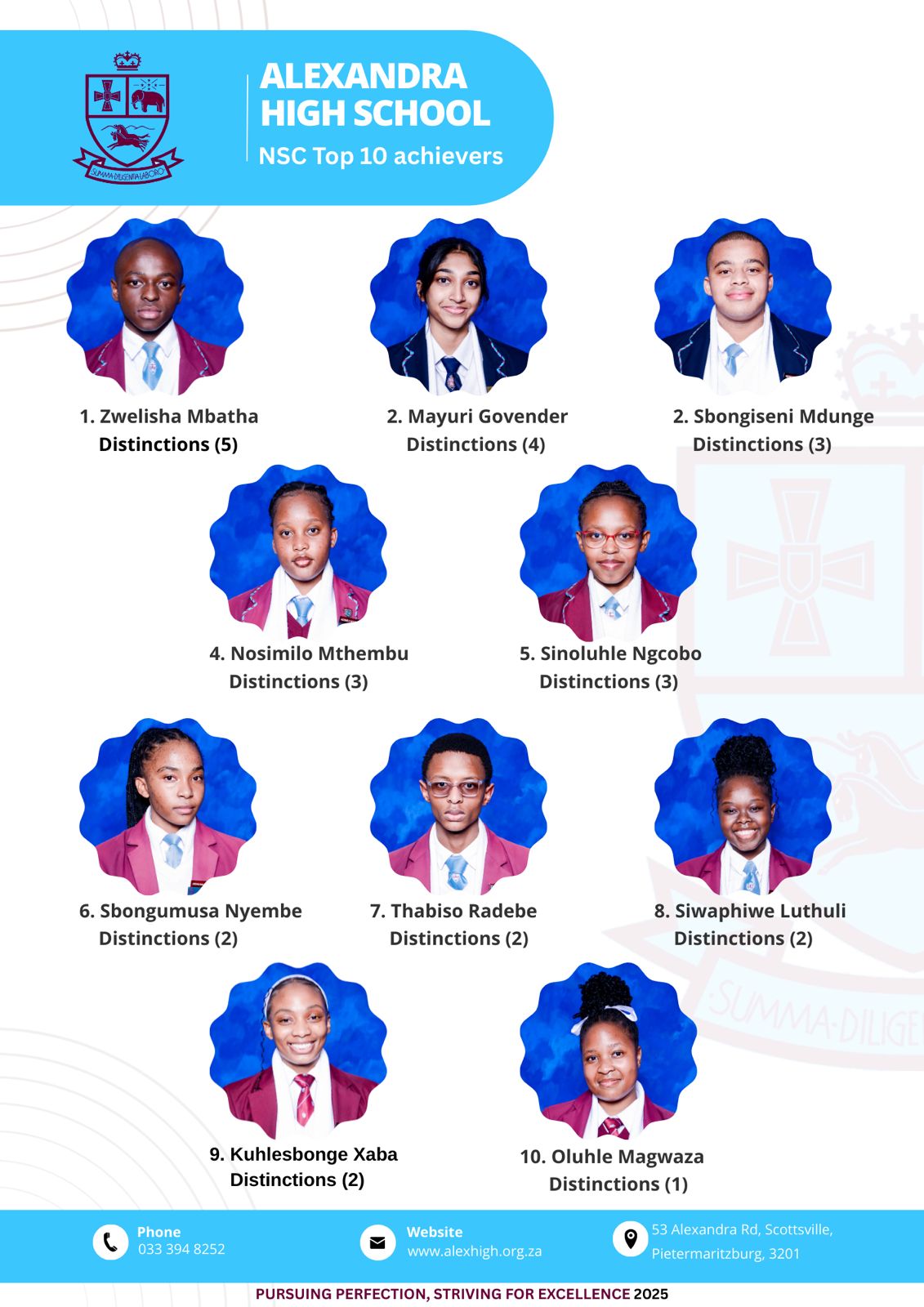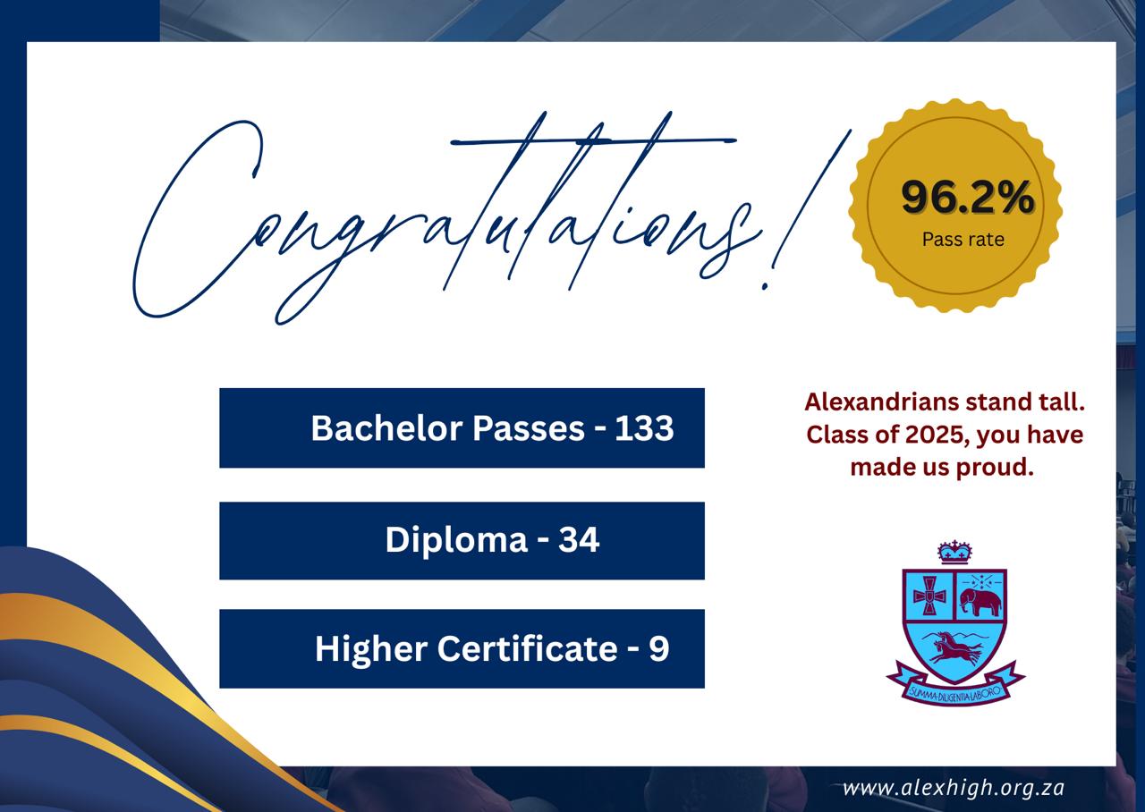 | Academic Awards (14/02/2020) At the Academic Awards Ceremony, held on Friday last week, Alexandra High School presented an Honours Certificate and the Price Waterhouse Cooper trophy to Teri Perumal, the Dux of the class of 2019. We wish her well in her chosen field of Accounting.With this ceremony Alexandrians celebrate the academic achievements of the previous year. Parents of prize-winners are invited to join us in acknowledging the accomplishments of those learners who always give of their best to realize their potential. |